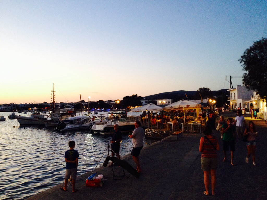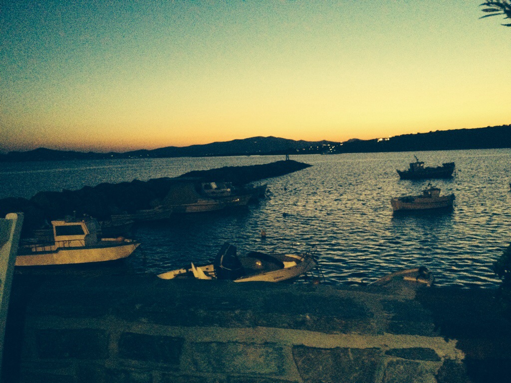 Think I am falling for this place … far too nice. Hope that this hasn’t spoilt me for the next islands! My expectations are GREAT ( Charles Dickens) I hear some of you say! Seriously, lovely island, unspoilt by tourists, very few Brits ( have I said that before). In fact, think I am the only one. Going to Antiparos tomorrow. Hopefully, going to see the caves. Freshly caught grilled sardines for dinner tonight. Sorry, no pic but here is my sunset view.