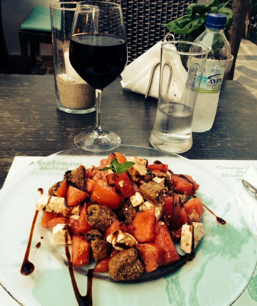 I felt I needed to write about the food here in Naxos. Those of you who have already sampled greek food (and are a fan) probably wont find this surprising but I am going to harp on about it anyway. I found this amazing restaurant in the centre of the Naxos city which was teaming with local people. This is exactly where I wanted to be. I ordered a special Naxos Greek salad which consisted of tomatoes, feta, water melon and barley rusk with added peppermint. It was to die for. This was obviously washed down with a large glass of red wine. I then went into the city where the hustle and bustle was taking place. Naxos city is so young and vibrant with lots of trendy bars and restaurants, waffle and ice cream kiosks serving lush frozen greek yogurts topped with just about anything you want. Mine was obviously topped with chocolate!! Enough of this talk about greek food .., Santorini tomorrow. Seawhathappens!